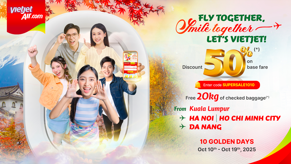Dari 10 hingga 19 Oktober 2025, pengembara Malaysia boleh menikmati diskaun sehingga 50% untuk tambang kelas Eco dengan memasukkan kod promo SUPERSALE1010 semasa tempahan di www.vietjetair.com atau aplikasi mudah alih Vietjet Air.